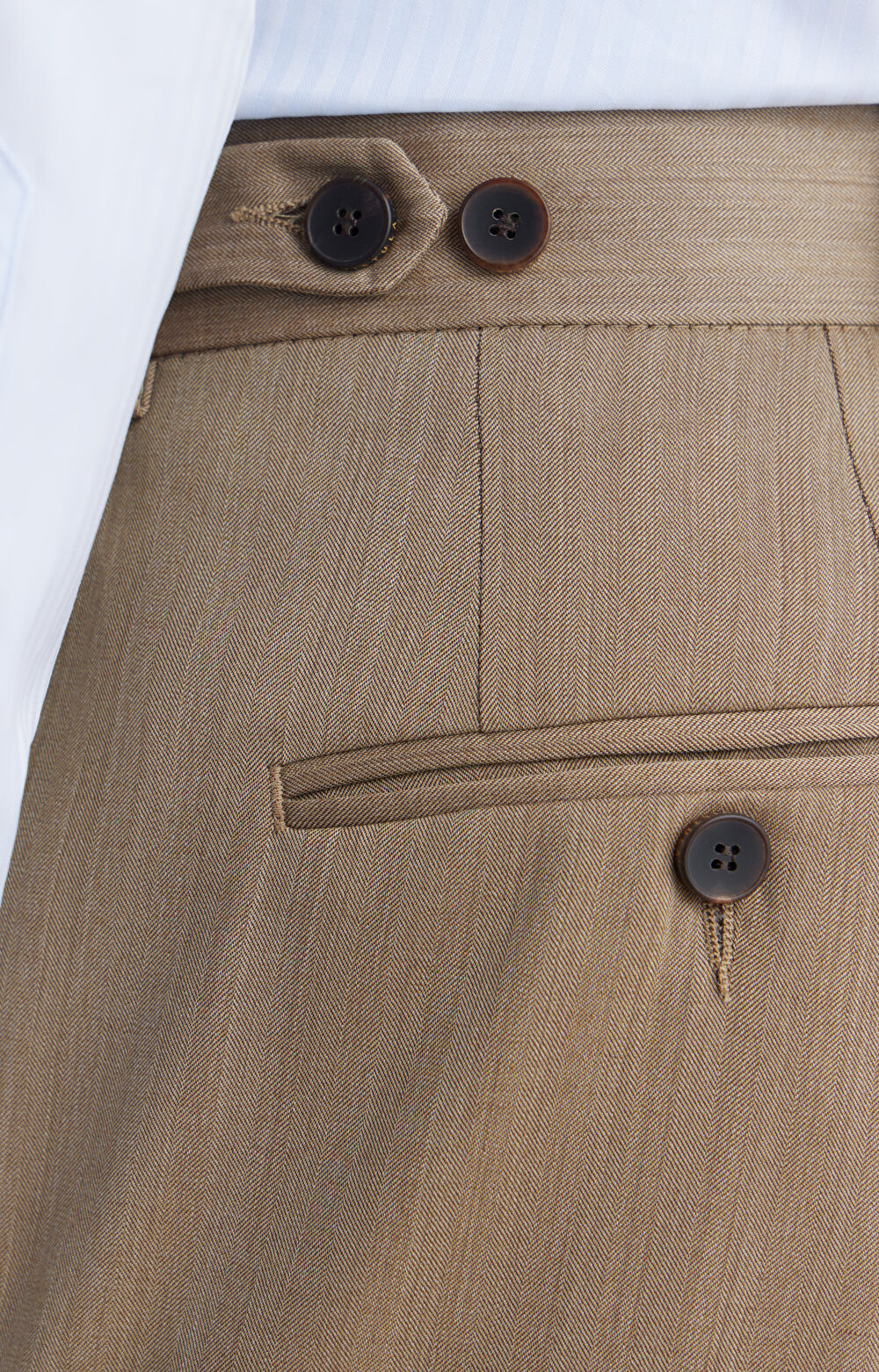 Spodnie męskie w kolorze beżowym, o kroju super slim. Wykonane zostały w Polsce z wysokiej jakości tkaniny wełnianej od renomowanego, włoskiego producenta Tallia Di Delfino. Wysoka oddychalność tkaniny sprawia, że spodnie są komfortowe w użytkowaniu. Spodnie posiadają kieszenie angielskie oraz dodatkową kieszonkę "zegarówkę" ukrytą w szwie pomiędzy paskiem talii i nogawką, z tyłu dwie kieszenie dwuwypustkowe zapinane na guziki. Z boku na pasku regulacja szerokości na guzik. Pasek wykończony został szlufkami. Doskonale zaprezentują się w połączeniu z marynarką, tworząc komplet garniturowy. Model na zdjęciu ma 185 cm wzrostu i prezentuje rozmiar 182/90.