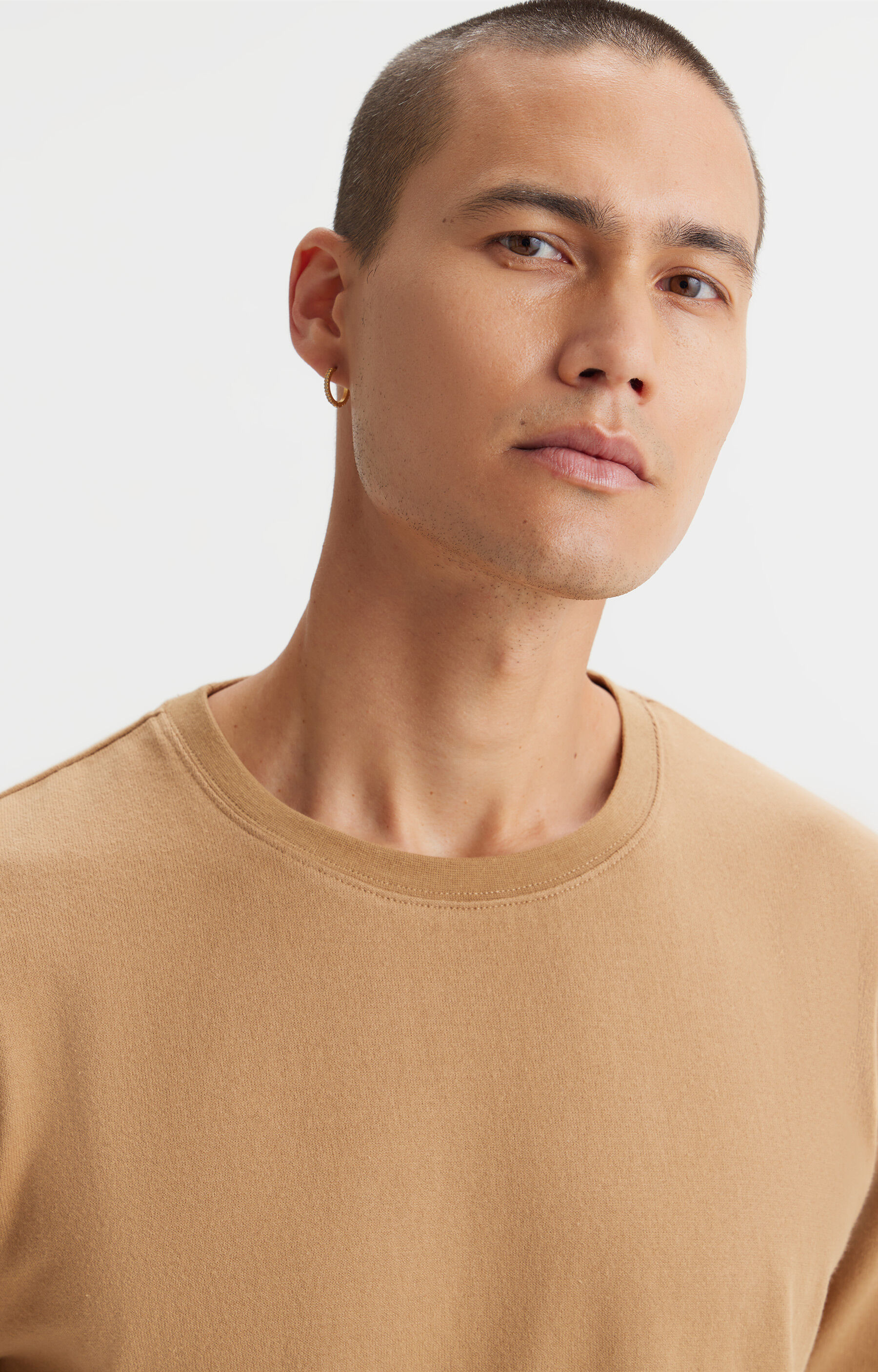 Gładki t-shirt męski w kolorze beżowym. Wykonany został z dzianiny bawełnianej. Klasyczny, jednokolorowy t-shirt to niezbędny element męskiej garderoby. Model na zdjęciu ma 187 cm wzrostu i prezentuje rozmiar M.