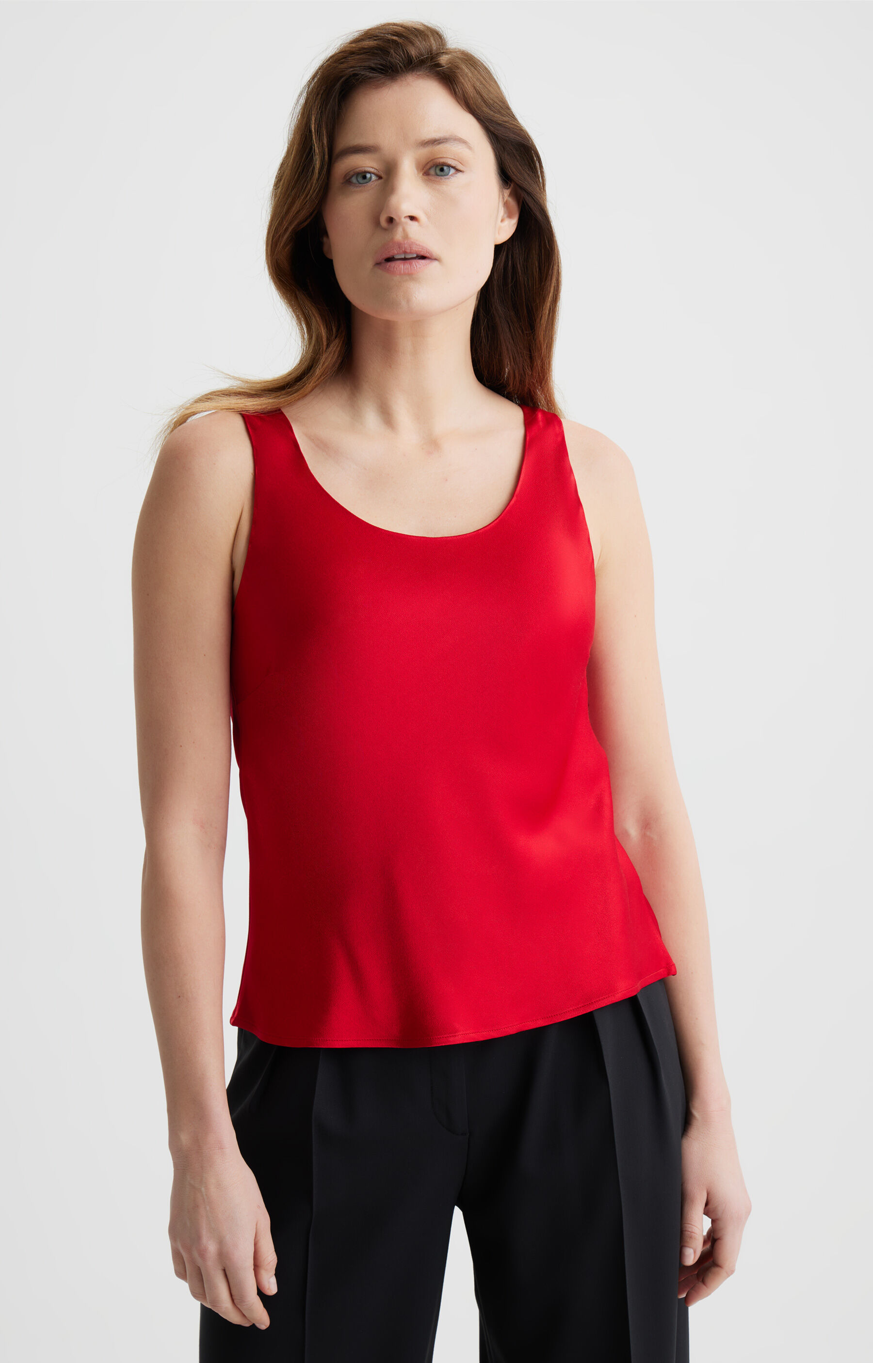 Bluzka damska w kolorze czerwonym na szerszych ramiączkach to doskonały wybór dla kobiet ceniących komfort i elegancję. Wykonana z miękkiej, oddychającej wiskozy, doskonale dopasowuje się do sylwetki, podkreślając jej atuty. Klasyczny dekolt typu round neck nadaje jej uniwersalny charakter, dzięki czemu świetnie sprawdzi się zarówno w codziennych, jak i bardziej eleganckich stylizacjach. To idealna baza do wielu zestawów – można nosić ją solo w