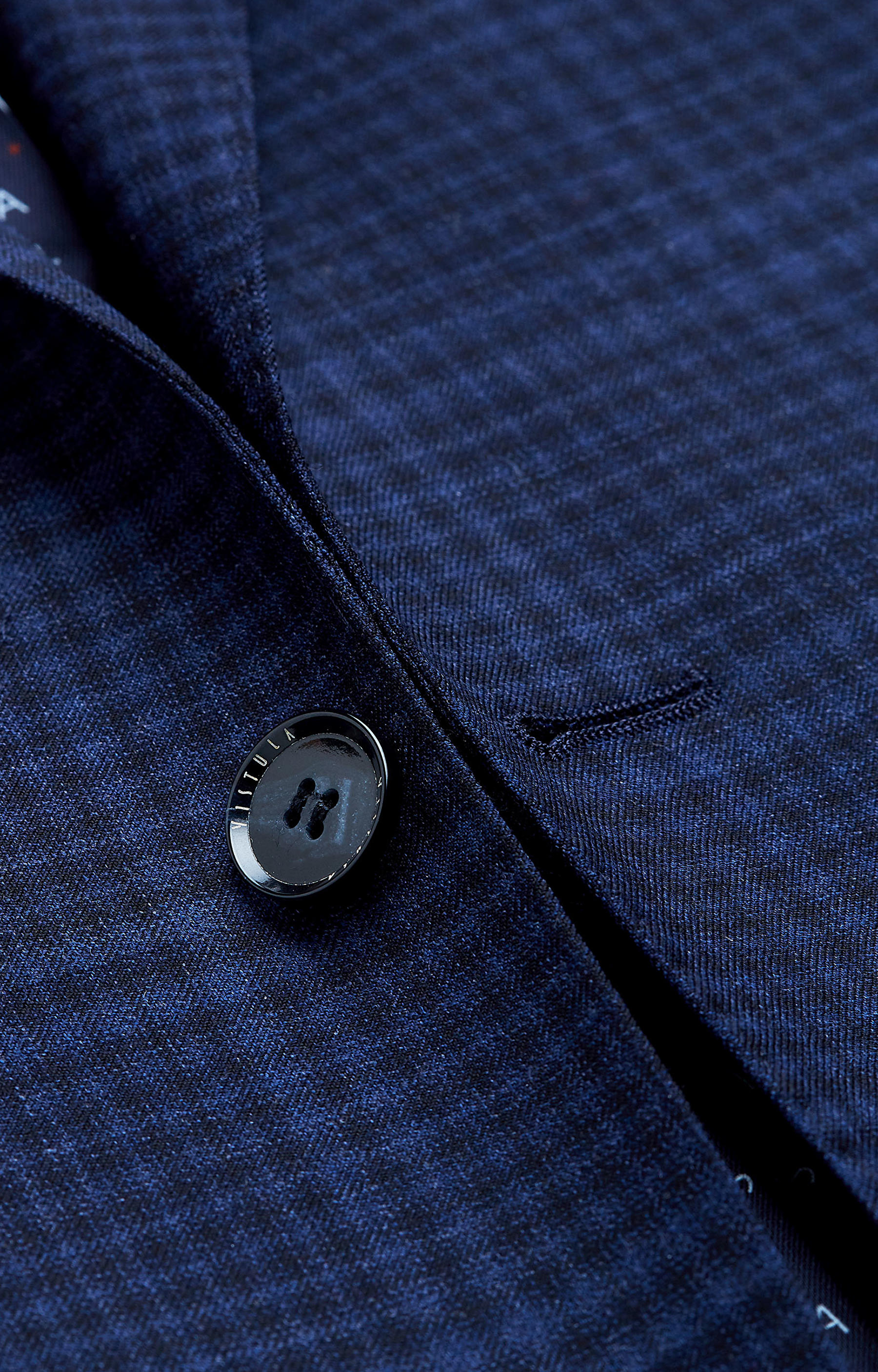 Garnitur New Savoy T One to jednorzędowy garnitur w czarno-granatową kratę. Został wykonany z wełny z niewielkim dodatkiem elastanu. Marynarka jest bardzo dobrze dopasowana do sylwetki. Zapinana jest na dwa guziki. Ma klapy w szpic, kieszenie boczne dwuwypustkowe z patkami, na piersi kieszonkę z listewką. Z tyłu znajdują się dwa rozcięcia. Spodnie bez zakładek, o dopasowanym kroju, z zaprasowanym kantem, z angielskimi kieszeniami. Całość została wykończona ozdobnym przeszyciem AMF, nawiązującym do krawiectwa w tradycyjnym stylu.