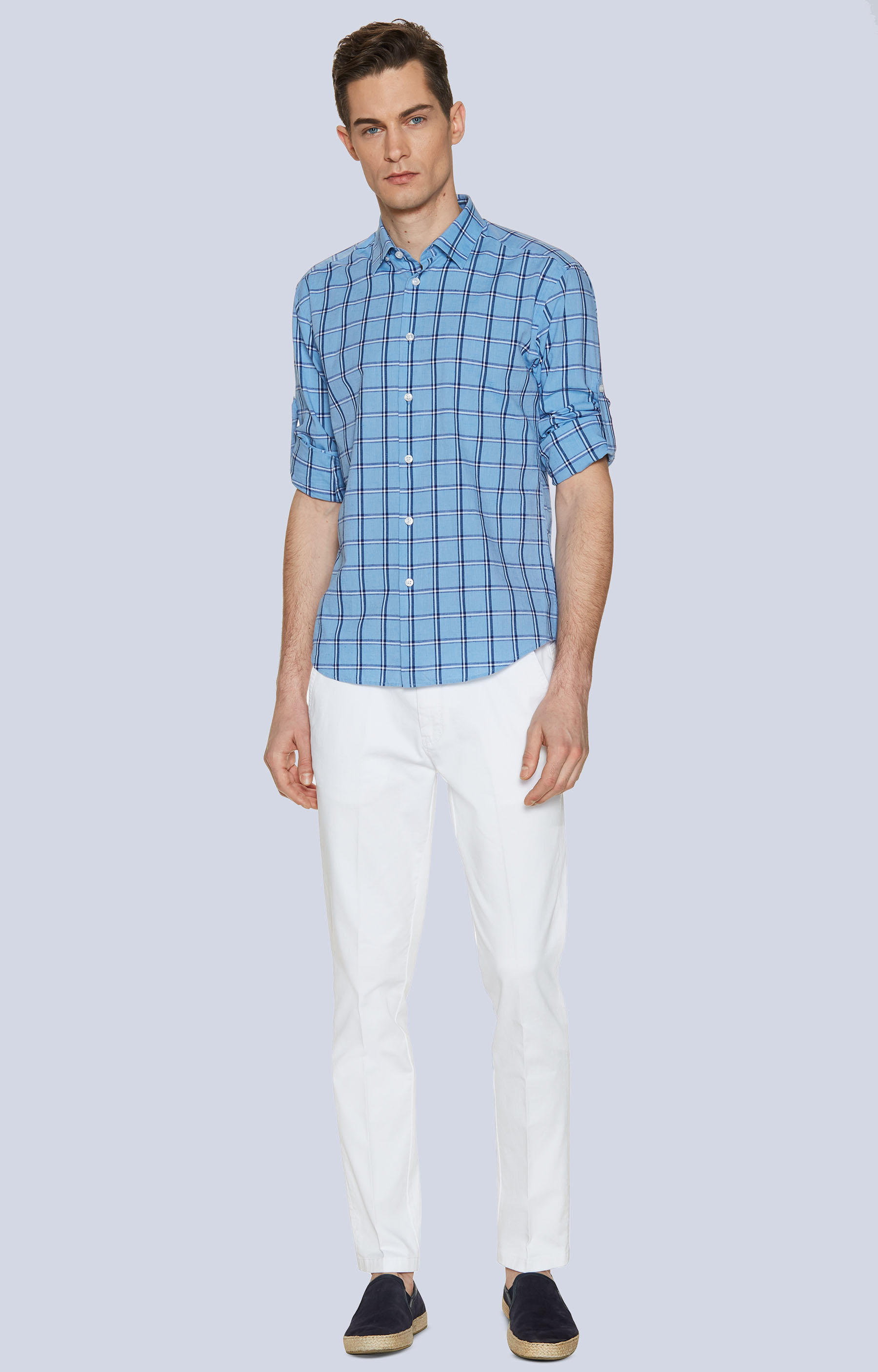 Koszula męska Ino w linii Capri z błękitnej tkaniny we wzór w niebiesko-białą kratę. Wykonana została z wysokiej jakości mieszanki bawełny oraz lnu. Mankiet zapinany jest na guzik, rękawy z możliwością regulacji długości. Kołnierz typu button-down. Sylwetka dopasowana, plecy gładkie. Koszula doskonała do casualowych stylizacji.