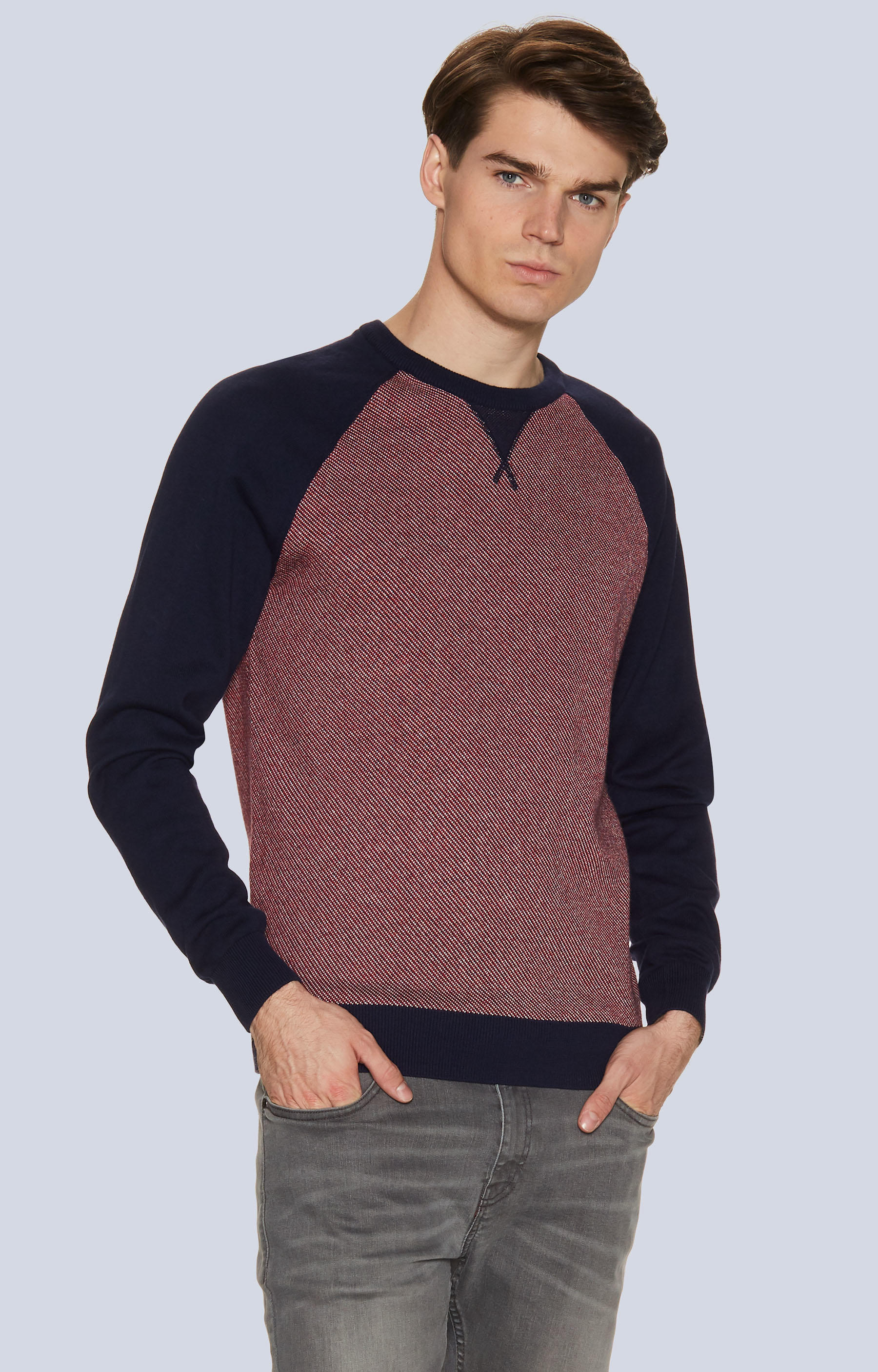 Sweter męski Jeford Duo typu round-neck w linii Vistula ze strukturalnej dzianiny w kolorze czerwonym. Dół i rękawy wykończone są szerokim ściągaczem w kolorze ciemnogranatowym. Doskonały sweter na co dzień.