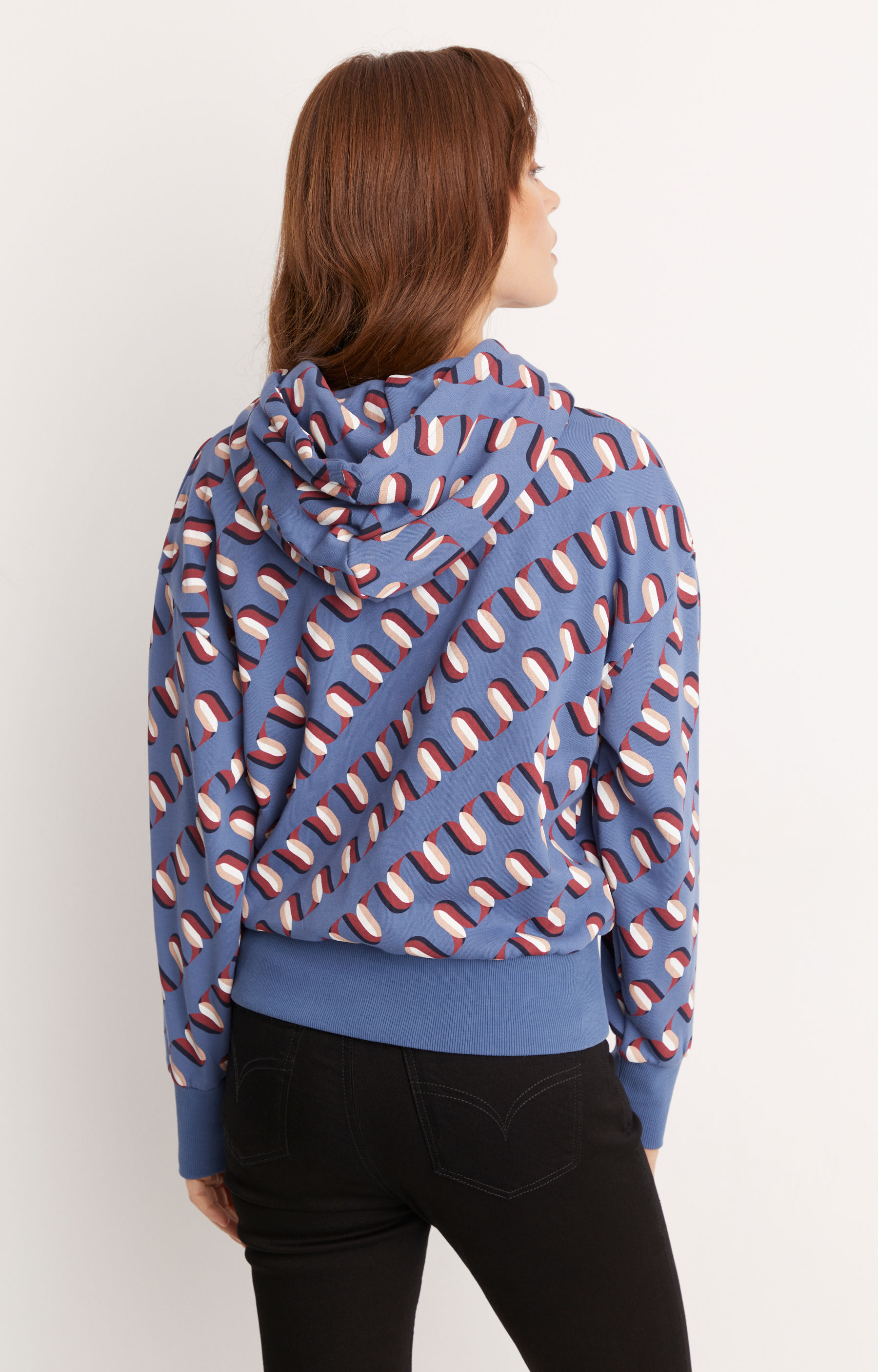 Bluza damska Nola Hoodie w linii Vistula Woman, w kolorze niebieskim to luźna bluza z wysokimi ściągaczami, wkładana przez głowę. Jej elementem charakterystycznym jest nadruk. Posiada kaptur oraz nakładaną kieszeń z przodu.