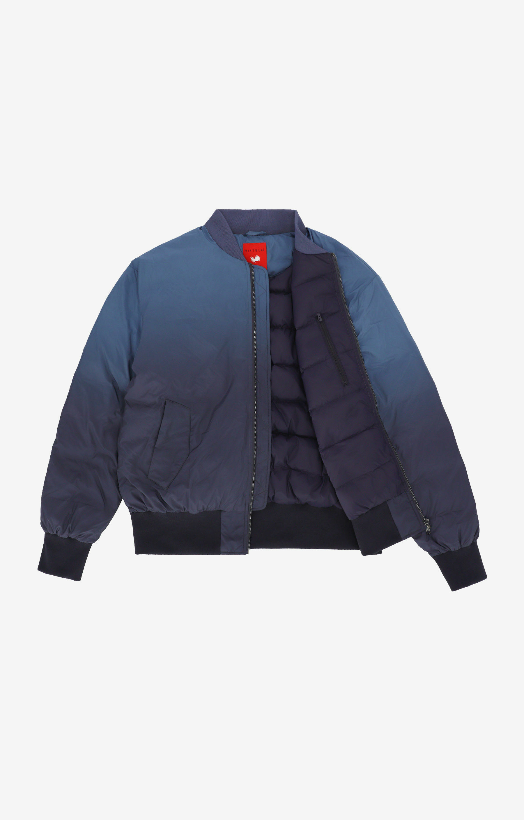 Kurtka męska Misty Jacket w kolorze niebieskim to kurtka typu bomber, luźna z wysokimi ściągaczami oraz stójka ze ściągacza. Wykonana została z lekkiego drukowanego poliestru. Kurta z lekkim puchowym wypełnieniem, zapinana na metalowy zamek, kieszenie boczne. Na piersi mały monochromatyczny nadruk brandowy.