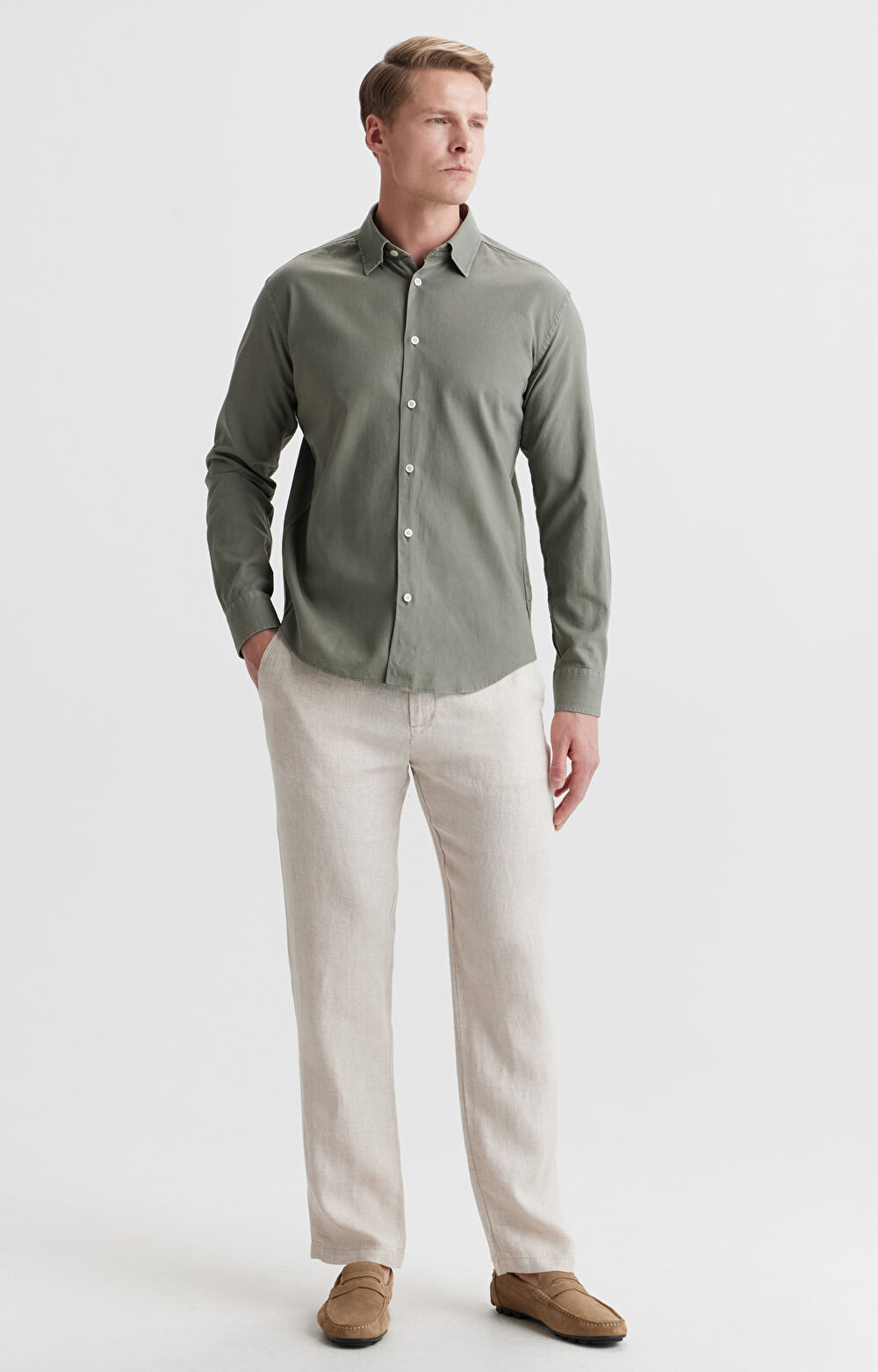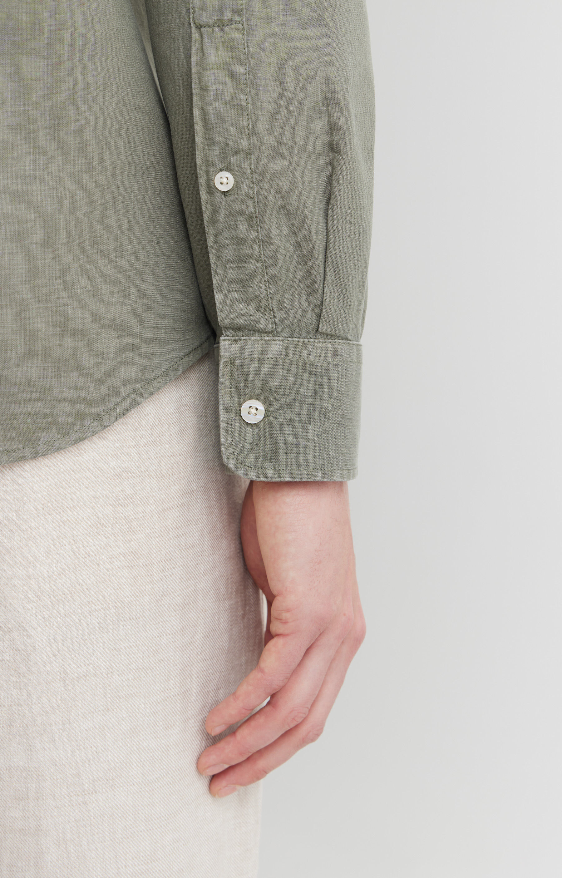 Koszula męska w kolorze oliwkowym, o kroju slim fit to doskonały wybór na co dzień dla mężczyzn ceniących komfort i naturalne tkaniny. Połączenie bawełny i lnu sprawia, że materiał jest przewiewny, lekki i przyjemny w dotyku, idealny zarówno na ciepłe dni, jak i do warstwowych stylizacji. Kołnierz kent kryty button down dodaje koszulom subtelnej elegancji, sprawiając, że świetnie komponują się zarówno z casualowymi, jak i bardziej dopracowanymi zestawami. Całość dopełniają guziki z logo, podkreślające dbałość o detale i wysoką jakość wykonania. Model na zdjęciu ma 185 cm wzrostu i prezentuje rozmiar M.