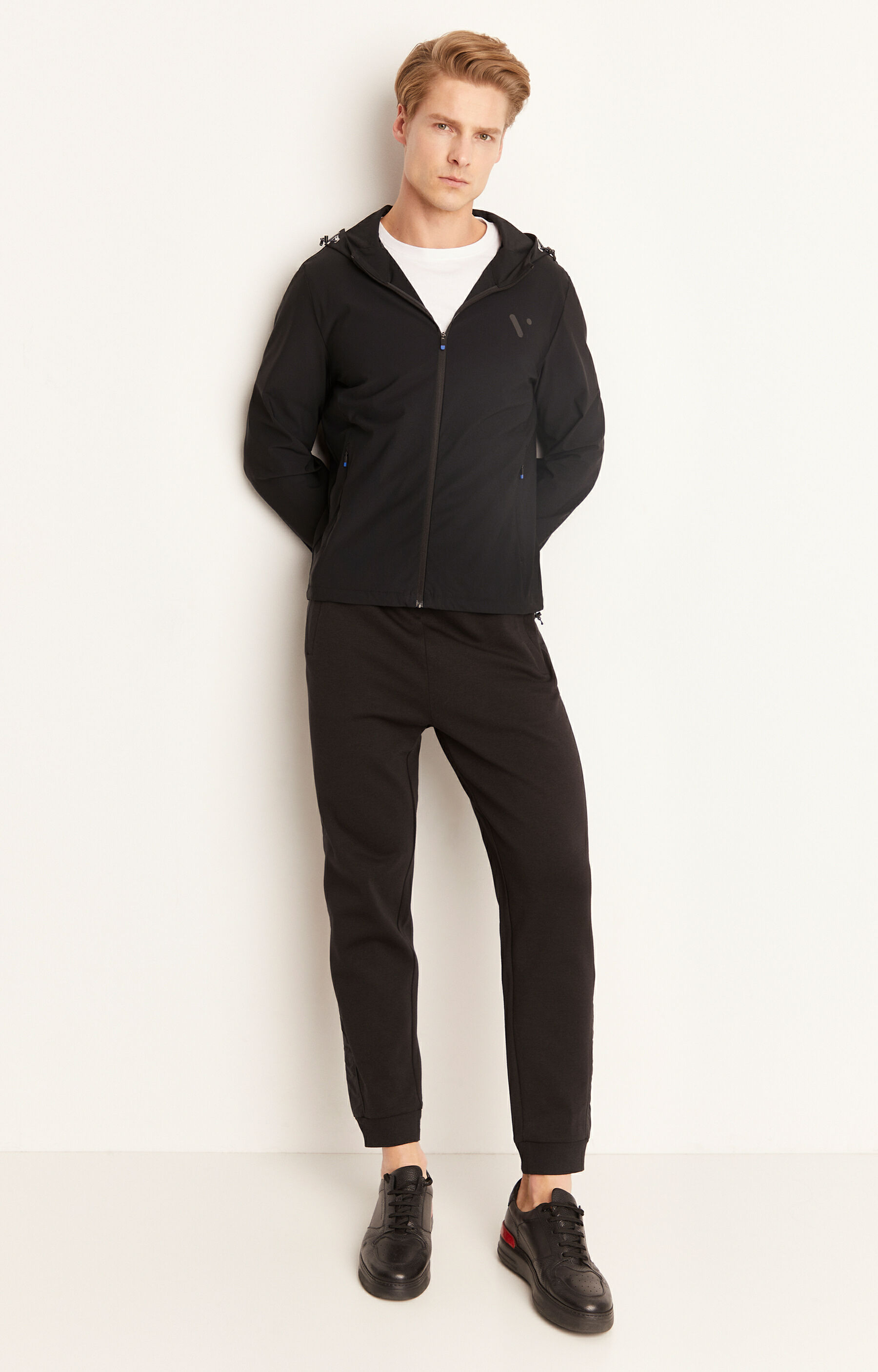 Bluza męska w kolorze czarnym z logo. Wykonana została z mieszanki bawełny oraz elastanu. Zapinana jest na zamek błyskawiczny. Bluza wyposażona została w kaptur, kieszenie boczne zasuwane na zamek oraz elementy odblaskowe. Przy kapturze posiada elastyczną gumkę ze stoperami do regulacji szerokości. Model na zdjęciu ma 186 cm wzrostu i prezentuje rozmiar M.