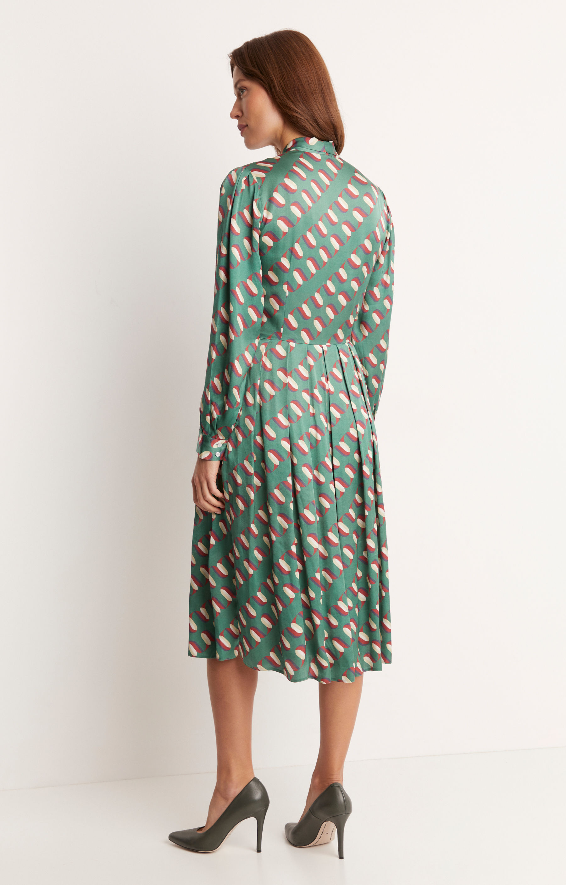 Sukienka Afrodyta w kolorze zielonym to sukienka bardzo kobieca w kształcie, ponadczasowa. Model z długim rękawem zakończonym mankietem (miękki mankiet na dwa guziki oblekanie materiałem zasadniczym), na szczycie rękawów po cztery fałdy, dzięki czemu ładnie się rozkładają i budują delikatną sylwetkę ramion. Przód zapinany na kryte guziki, stójka wykończona szarfą do wiązania. Sukienka odcięta w pasie, delikatnie zbierające fałdy, rozkloszowująca się dołem z rozcięciem na prawym boku. Ten model został uszyty z wiskozowej satyny z nadrukiem, który został zaprojektowany specjalnie do tej kolekcji – all-over print czyli nadruk pokrywający całą powierzchnię materiału z powtarzającym się motywem graficznym. Jest to literka V w obłej geometrycznej formie układającej się w diagonalne panele. Modelka na zdjęciu ma 177cm wzrostu i prezentuje rozmiar 36.